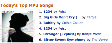 Oddly, or predictably I guess, the number 1 and number 4 (huh?) single at the Amazon store is 1234 by Feist.