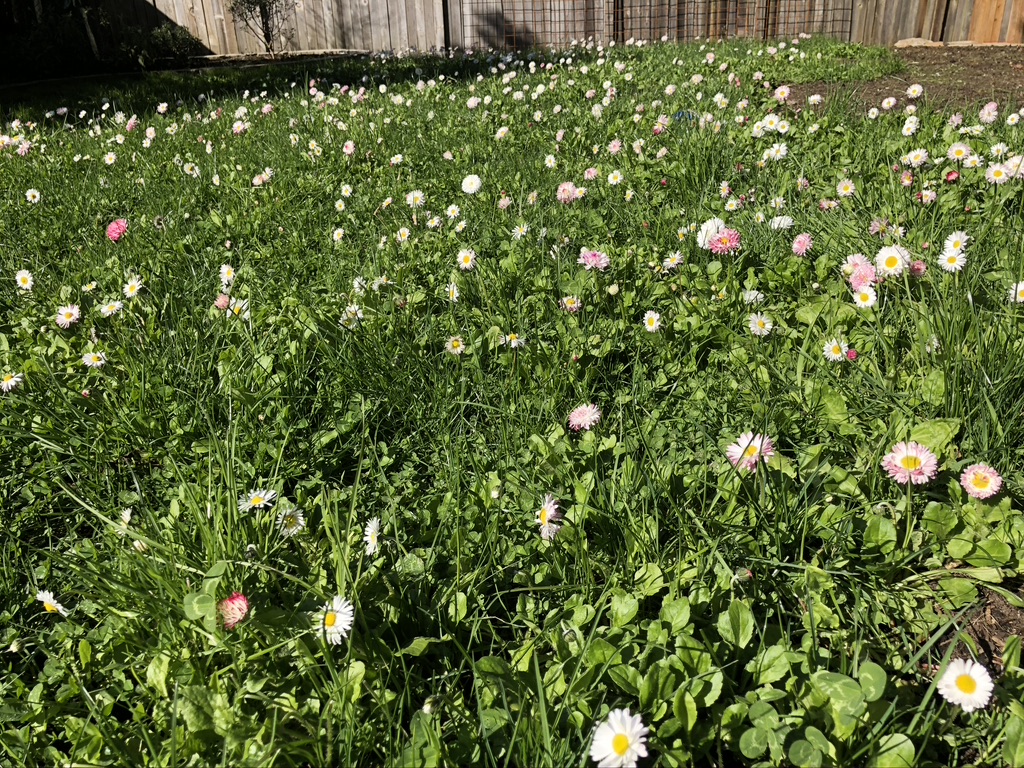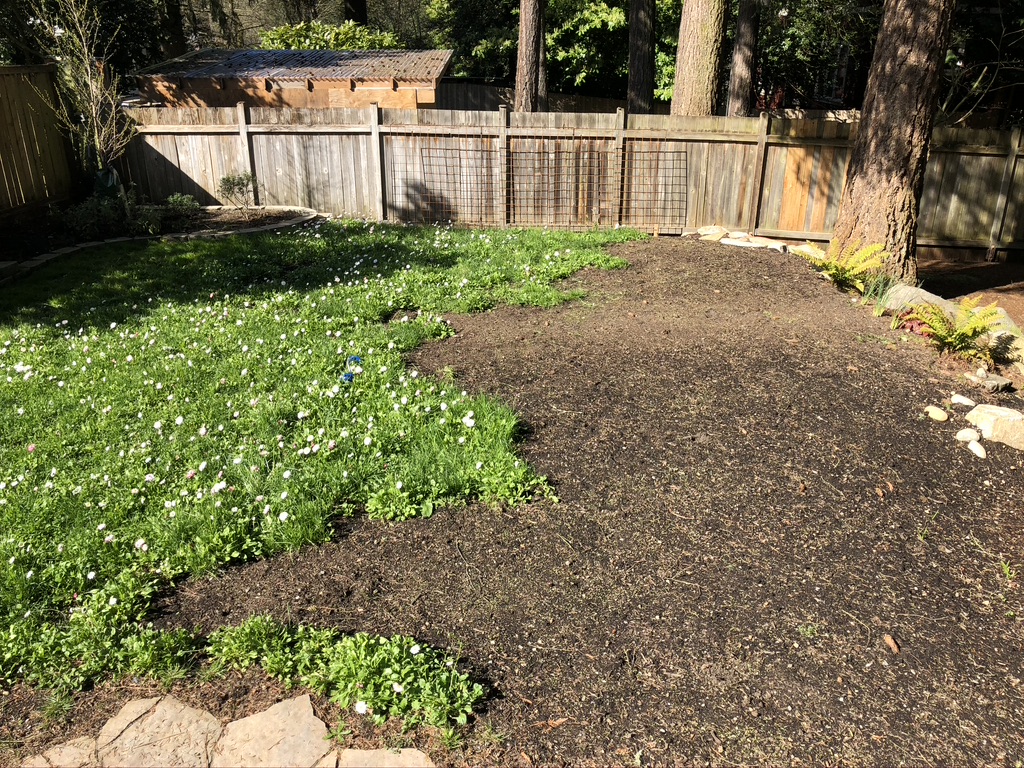 They are cute… but a total PITA. But, this is spring and the seeds I scattered are coming up. It is a mix of grass and flowers called Fleur De Lawn from Portland Seed Company. I am adding some other flowers to the mix this year (Alyssum, Dwarf Lupin, Crimson Clover, and others). It is really lovely to sit out back amongst the daisies, clover, baby blue eyes et al. And, bonus points, you only mow it once a month.